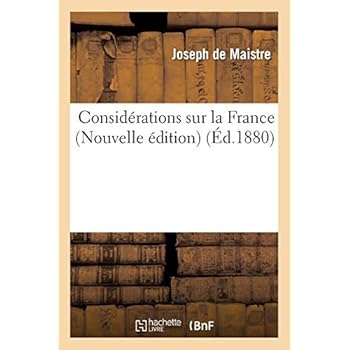 Considérations sur la France (Nouvelle édition) / par le Cte Jph de Maistre...Date de l'édition originale : 1880Sujet de l'ouvrage : France -- 1795-1799 (Directoire)Le présent ouvrage s'inscrit dans une politique de conservation patrimoniale des ouvrages de la littérature Française mise en place avec la BNF.HACHETTE LIVRE et la BNF proposent ainsi un catalogue de titres indisponibles, la BNF ayant numérisé ces œuvres et HACHETTE LIVRE les imprimant à la demande.Certains de ces ouvrages reflètent des courants de pensée caractéristiques de leur époque, mais qui seraient aujourd'hui jugés condamnables.Ils n'en appartiennent pas moins à l'histoire des idées en France et sont susceptibles de présenter un intérêt scientifique ou historique.Le sens de notre démarche éditoriale consiste ainsi à permettre l'accès à ces œuvres sans pour autant que nous en cautionnions en aucune façon le contenu.Pour plus d'informations, rendez-vous sur www.hachettebnf.fr